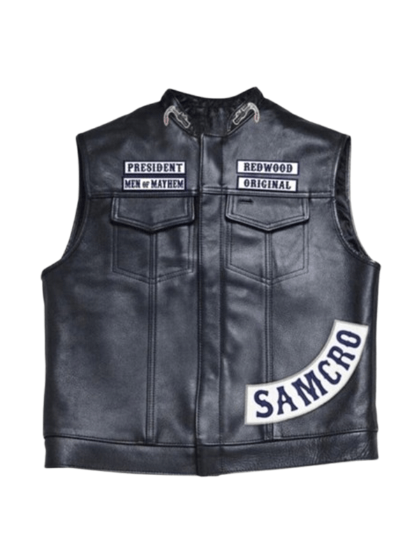 - Patches on Chest: President, Men of Mayhem, Redwood, Original, SAMCRO
